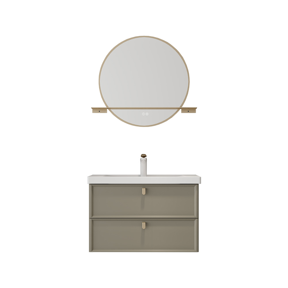 - 新中式设计元素:徽派建筑元素(吸塑造型门板提取马头墙元素,香槟金带纹理造型拉手提取飞檐和琉璃瓦元素),金属包边圆镜搭配触控氛围灯设计,传统与时尚碰撞,呈现新中式格调