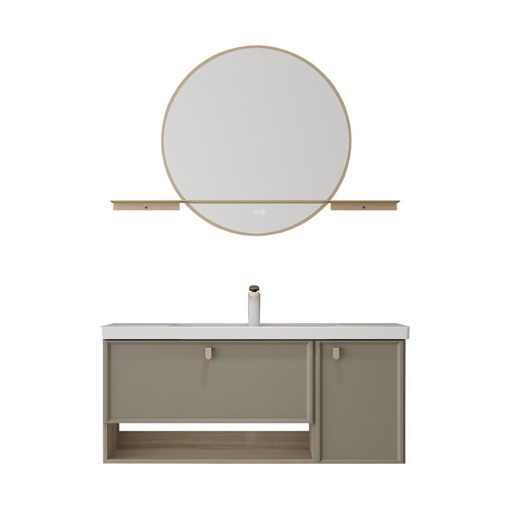 - 新中式设计元素:徽派建筑元素(吸塑造型门板提取马头墙元素,香槟金带纹理造型拉手提取飞檐和琉璃瓦元素),金属包边圆镜搭配触控氛围灯设计,传统与时尚碰撞,呈现新中式格调