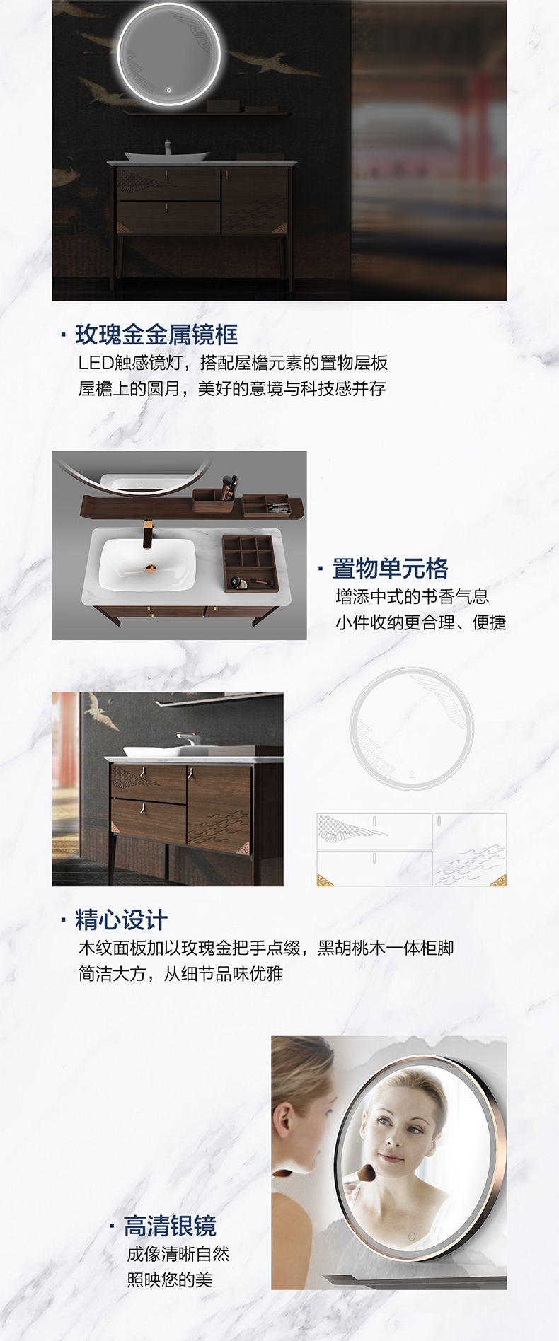 - 汲取仙鹤、祥云、水纹等传统中式宫廷元素,缔造新中式美学卫浴空间;