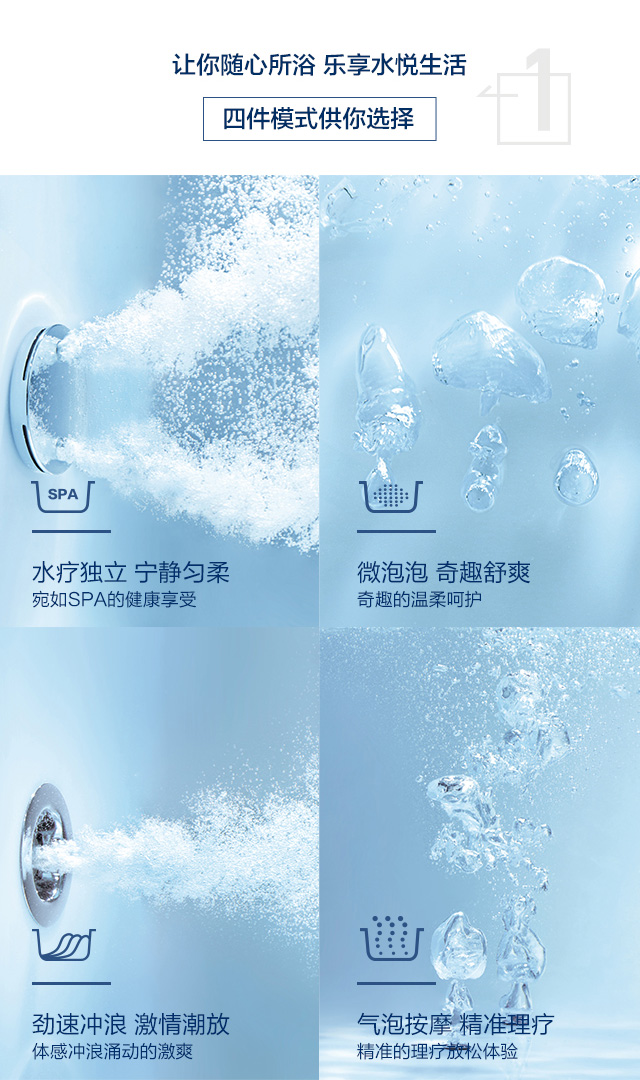 • 水疗独立按摩系统、劲速冲浪按摩系统、微泡泡按摩系统及汽泡按摩系统三件模式供你选择,让你随心所浴,乐享水悦生活