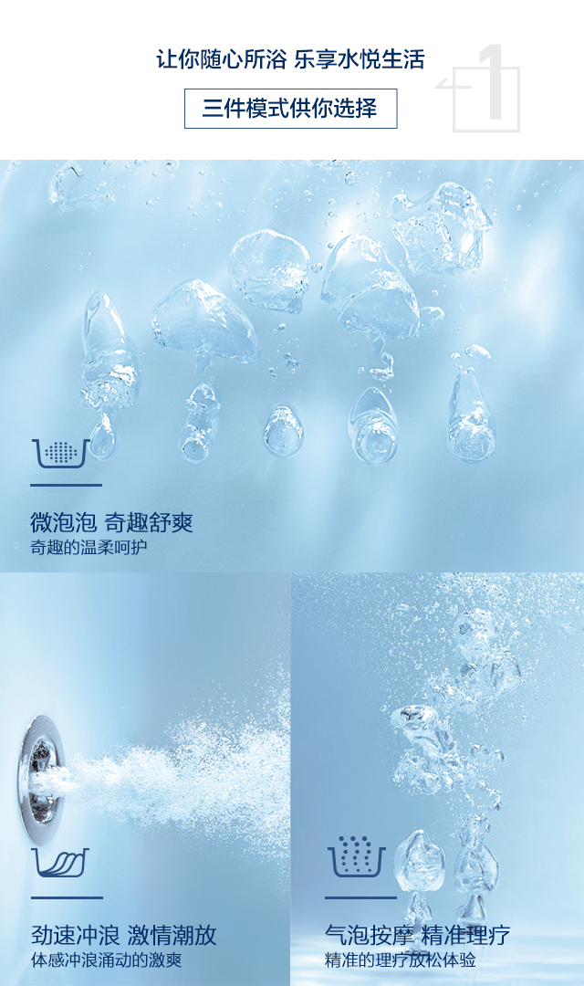 劲速冲浪按摩系统、微泡泡按摩系统及汽泡按摩系统三件模式供你选择,让你随心所浴,乐享水悦生活