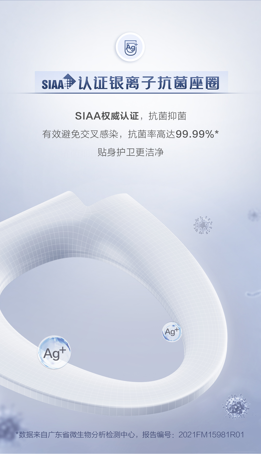• SIAA认证银离子抗菌座圈:SIAA权威认证,抗菌率高达99.99%