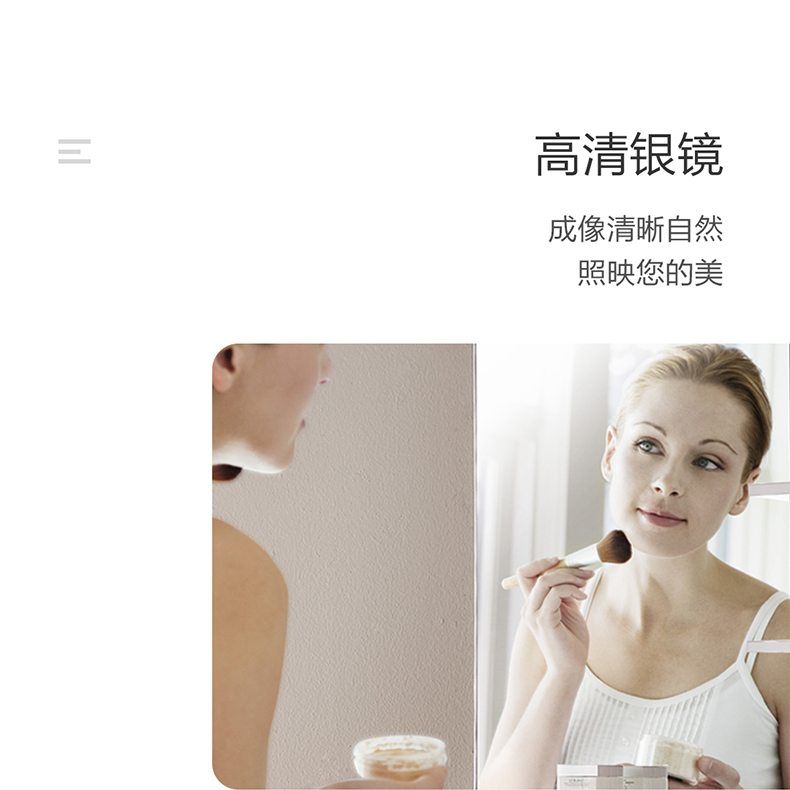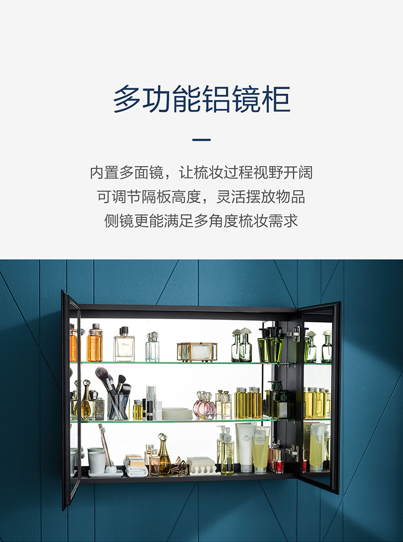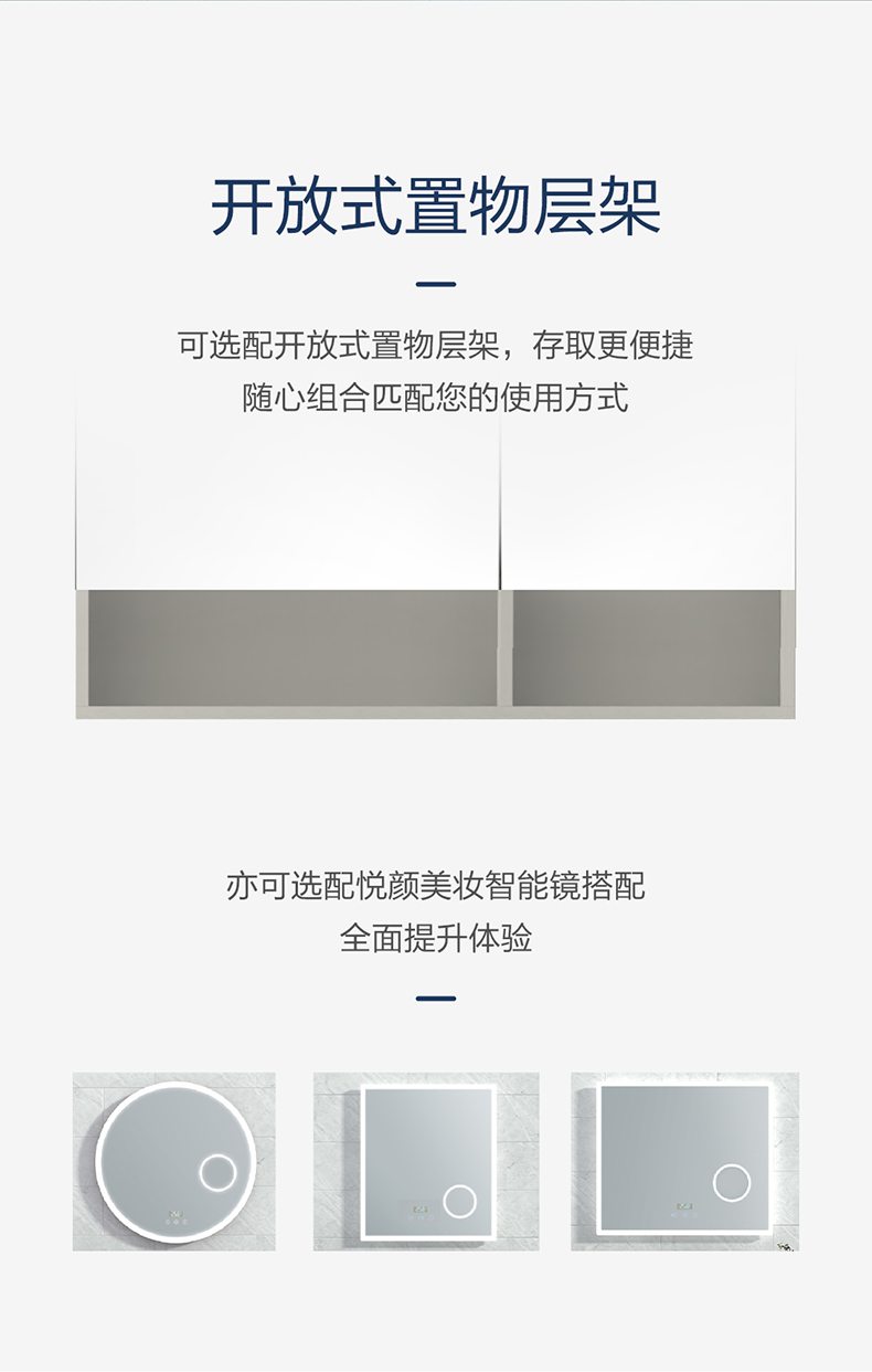 多功能铝镜柜:标配多功能铝镜柜,可升级为二代铝镜柜,或选配悦颜茄子APP视频下载全部镜搭配,全面提升体验;可选配开放式活动镜层架,存取更便捷;