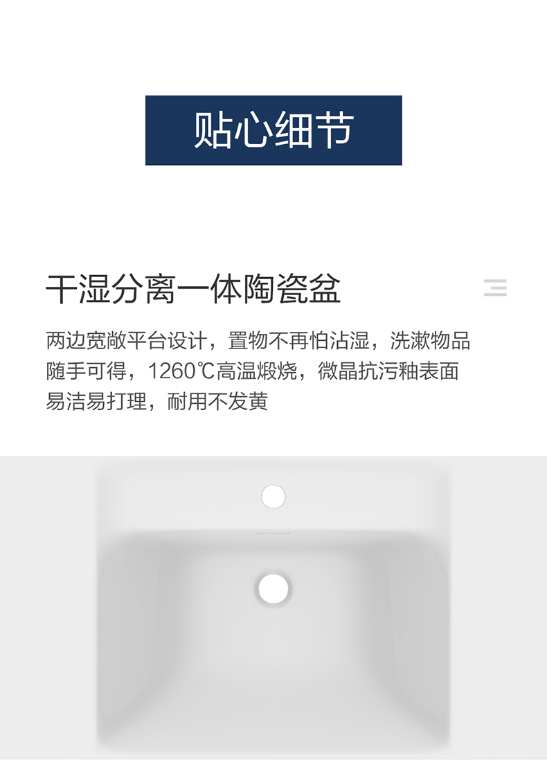 微晶易洁高温陶瓷盆:干湿分离一体陶瓷盆,置物不怕沾湿;两边宽敞平台设计,洗漱物品随手可得