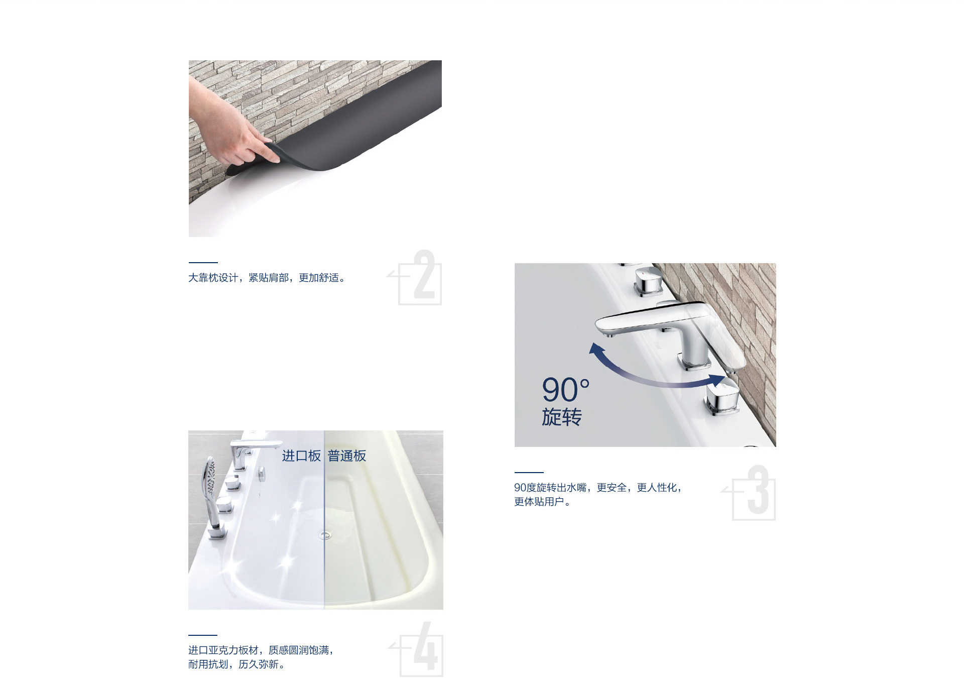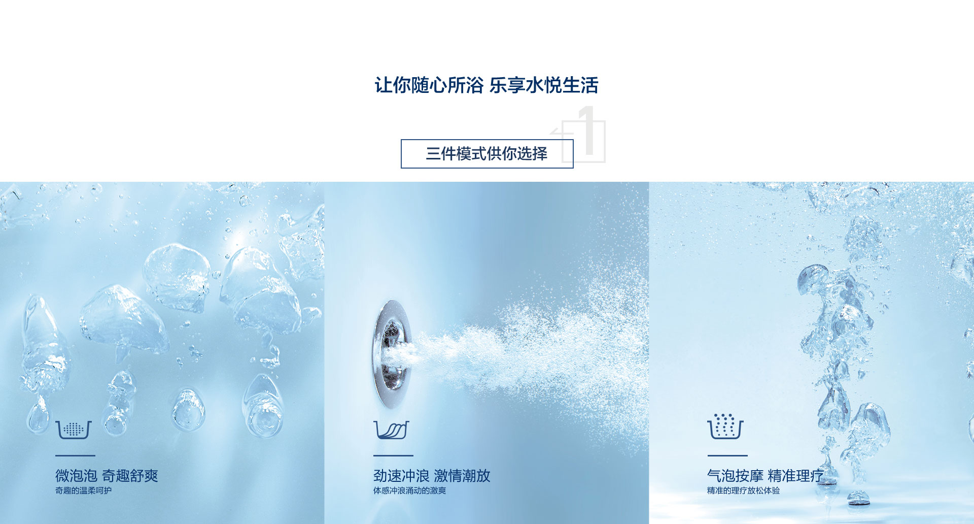 水疗独立按摩系统、劲速冲浪按摩系统、微泡泡按摩系统及汽泡按摩系统三件模式供你选择,让你随心所浴,乐享水悦生活